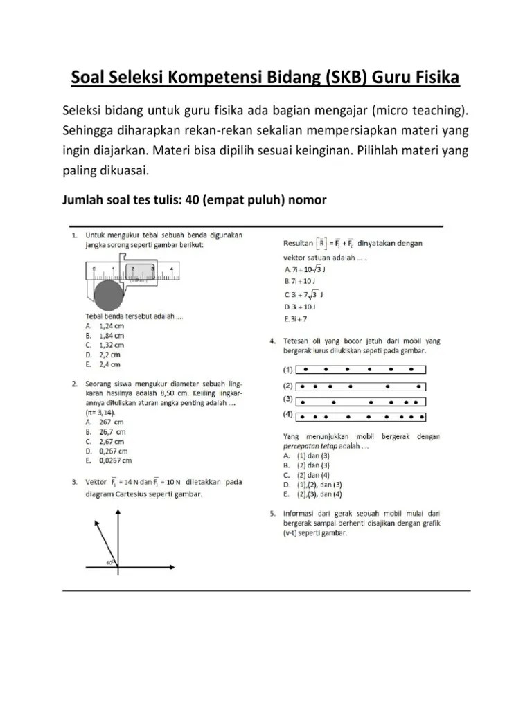 Soal skb guru fisika sma · soal skb guru ekonomi · soal skb guru biologi . Skb guru pkn · skb guru fisika sma · skb guru bahasa inggris . Contoh soal skb guru fisika sma 2018 dan jawabannya, kumpulan contoh soal seleksi kompetensi bidang (skb) guru fisika sma ahli pertama 2018. Kementerian pendidikan dan kebudayaan berencana mengadakan rekrutmen atau seleksi guru untuk . Soal seleksi kompetensi bidang (skb) guru fisika seleksi bidang untuk guru fisika ada bagian mengajar (micro teaching). Skb guru pendidikan agama islam. Untuk lebih jelasnya langsung saja download contoh soal skb guru fisika cpns 2018 pada link di bawah . Soal skb seleksi kompetensi bidang guru biologi smp sma smk seleksi cpns 2020/2021 akan terkait dengan standar kompetensi guru. Latihan soal tes seleksi pppk guru fisika sma smk tahun 2021. Mulai dari contoh soal seleksi kompetensi dasar ( skd) hingga seleksi kompetensi bidang (skb) cpns guru fisika 2021. Kumpulan download contoh soal skb cpns semua formasi, soal cpns online gratis.